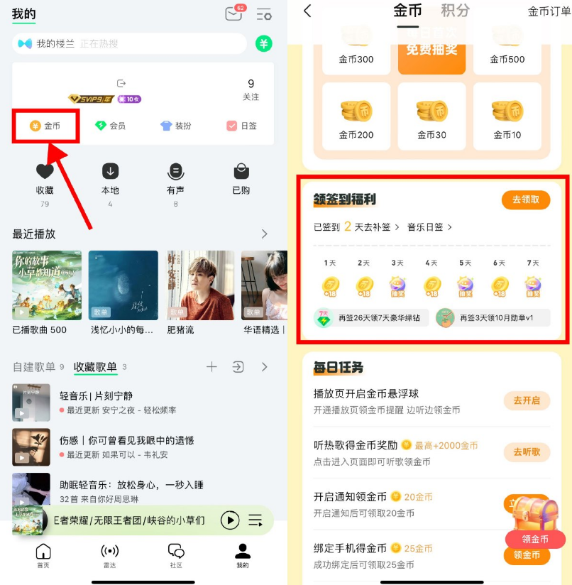 QQ音乐APP底部“我的”->点击“金币”进入->下拉签到28天可领7天绿钻会员