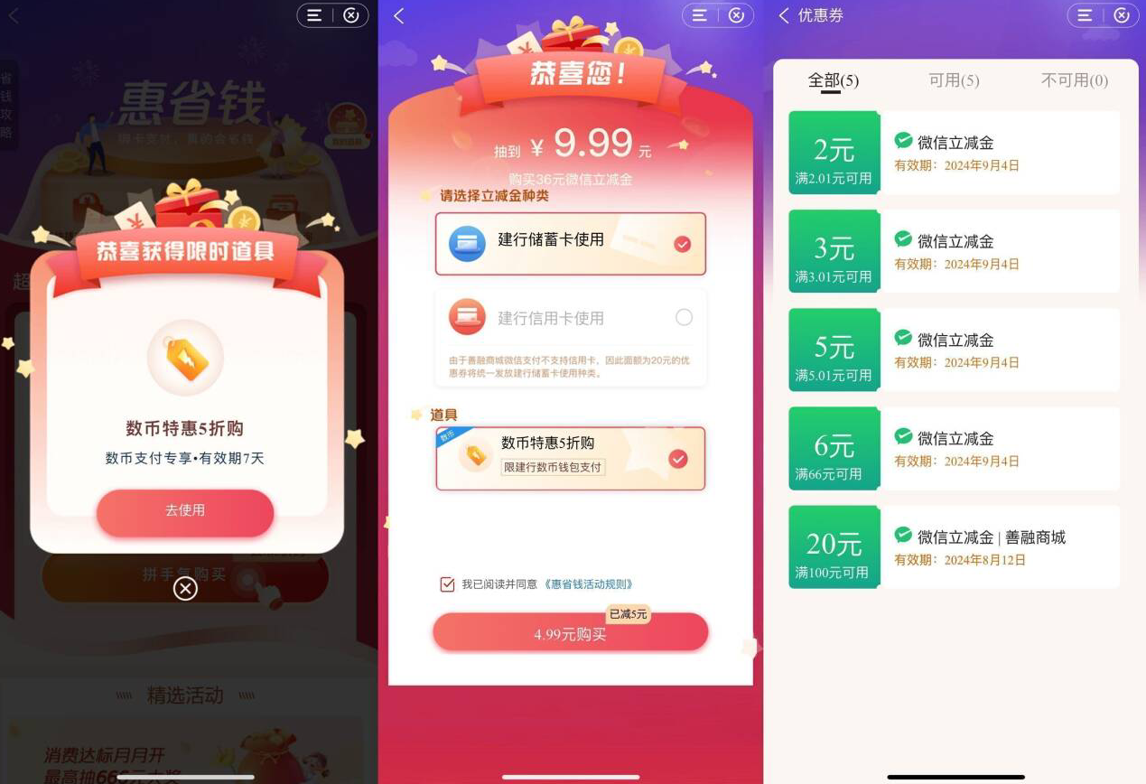 建行APP搜索“惠省钱”->部分人会弹出折扣券->抽取购买价格(大于8亓建议别买,部分人有限时道具可以立减)购买后在微信卡包中查看