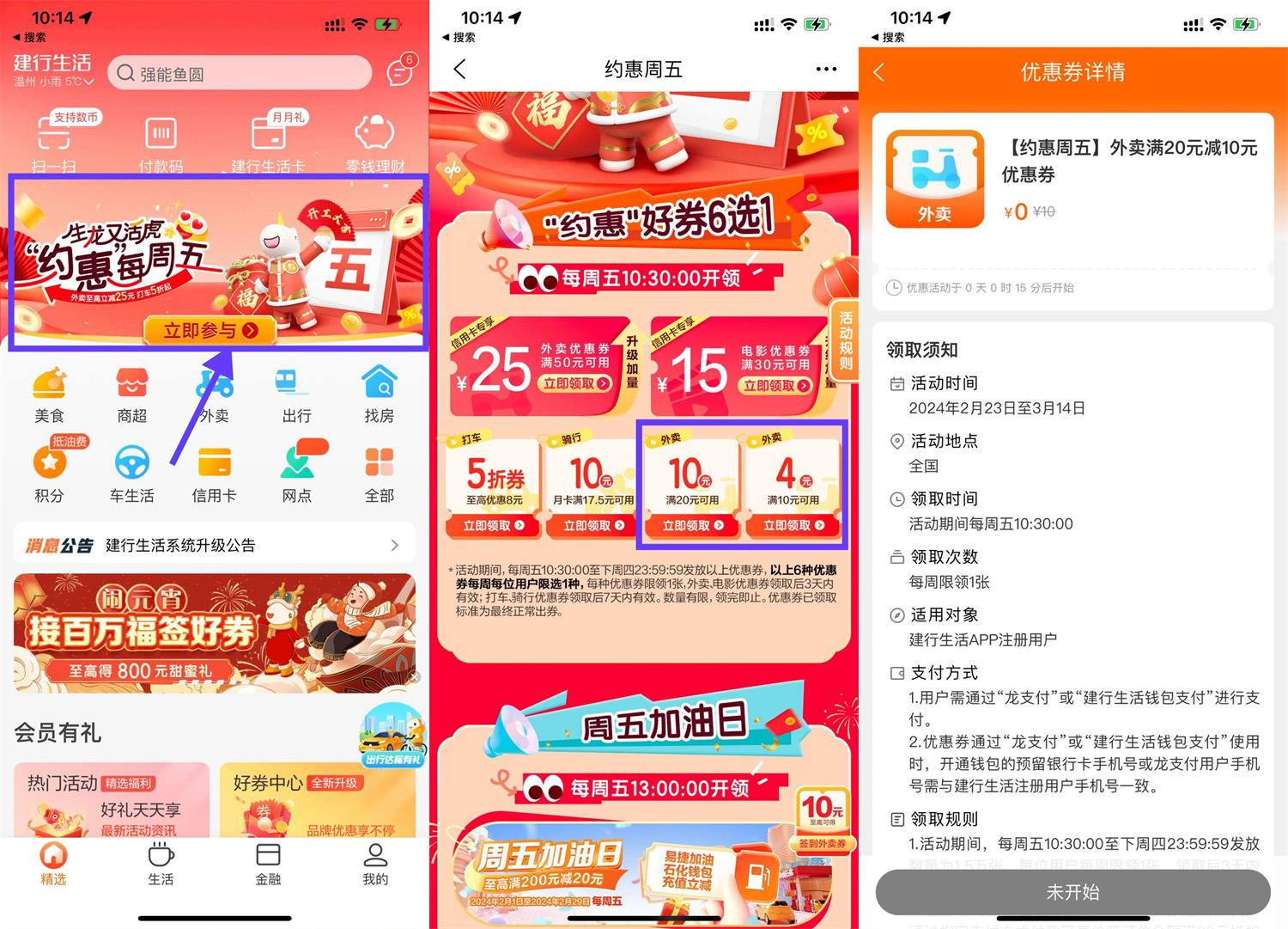建行生活APP->约惠每周五->准点抢20-10亓或10-4亓外卖满减券