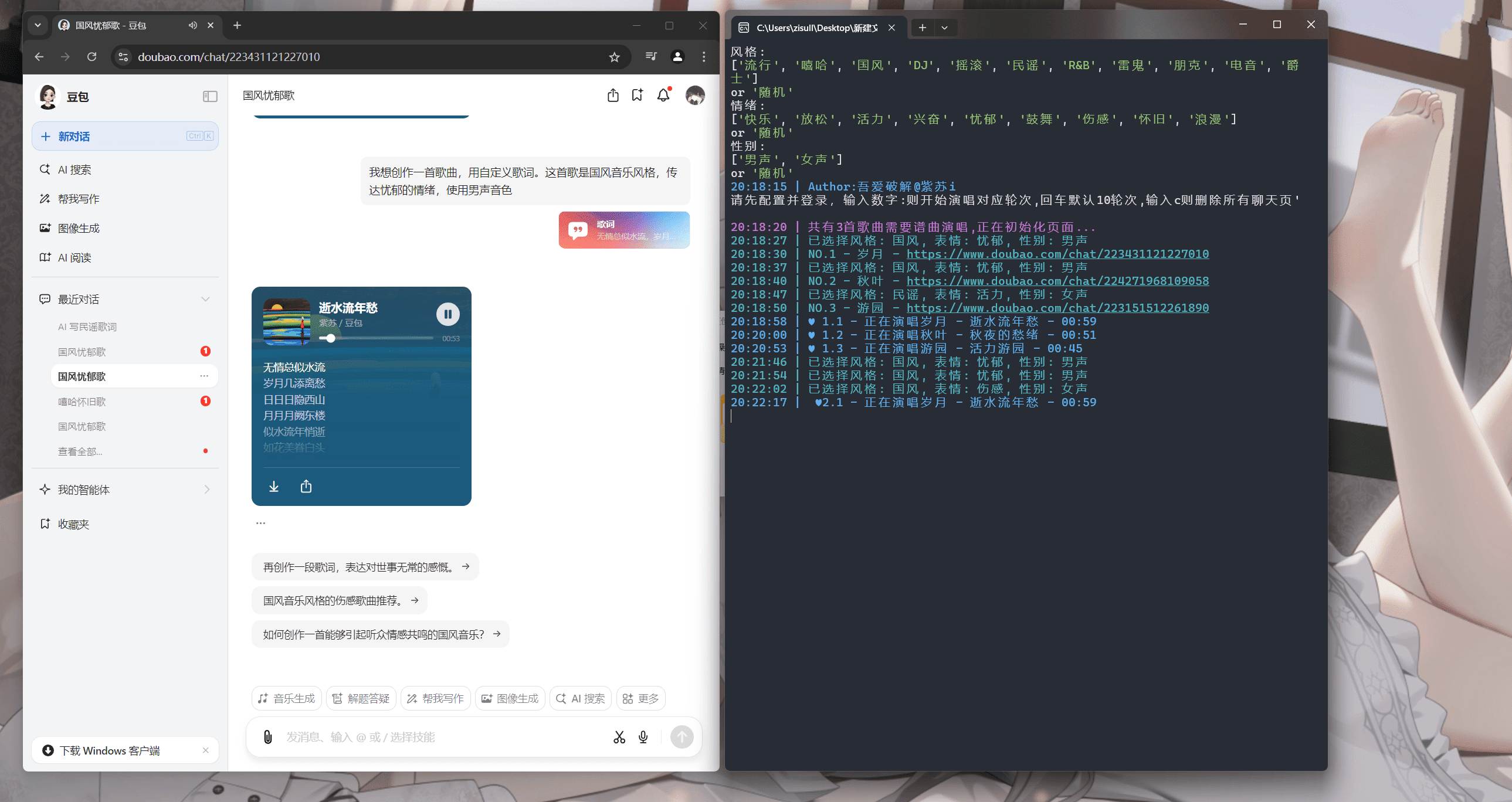 需要环境 谷歌浏览器 (没有谷歌浏览器的话 我已帮下好最新的安装包) 软件和配置表格要在同一目录下 操作流程: 根据表格里的格式配置任意数量歌曲 打开软件,登录账号,按回车键即可 输入c 是清理历史聊天会话 注意事项: 音乐生成最好置顶在前,网页端不要关闭或者最小化 音乐导出 豆包app 音乐导出 可以导出MV视频格式,电脑端下载音乐是黑屏的. 其他补充: 输入 c 只能清理会话列表 , 手机插件端 会话无法删除,可以在手机APP 上清除会话历史