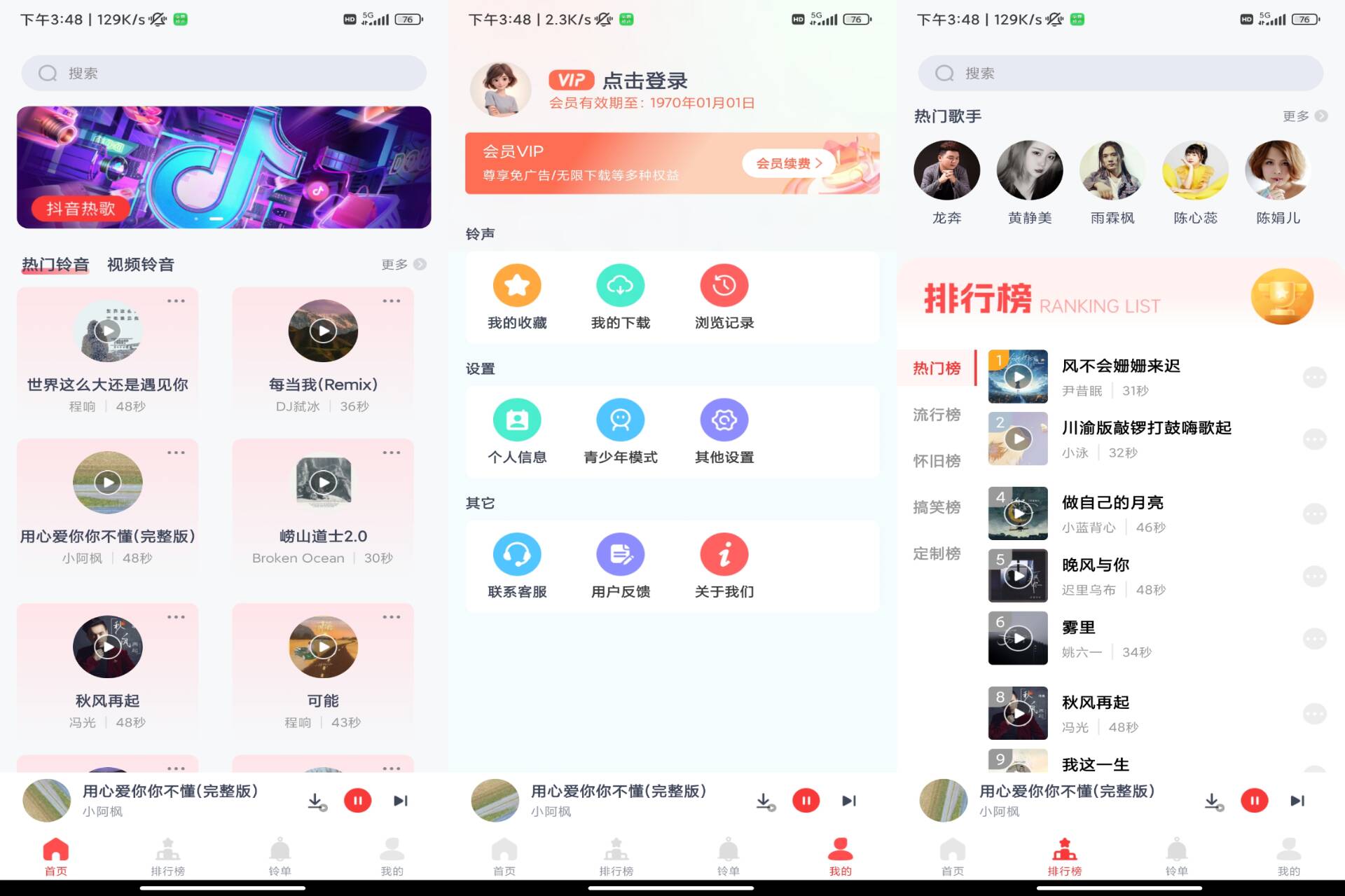一款提供海量好听铃声的应用,在App内你可以在首页、彩铃、来电视频中选择你喜欢的铃声,精选歌单:每天可以查看精选的歌单,用户可以自由点播,及时收听。