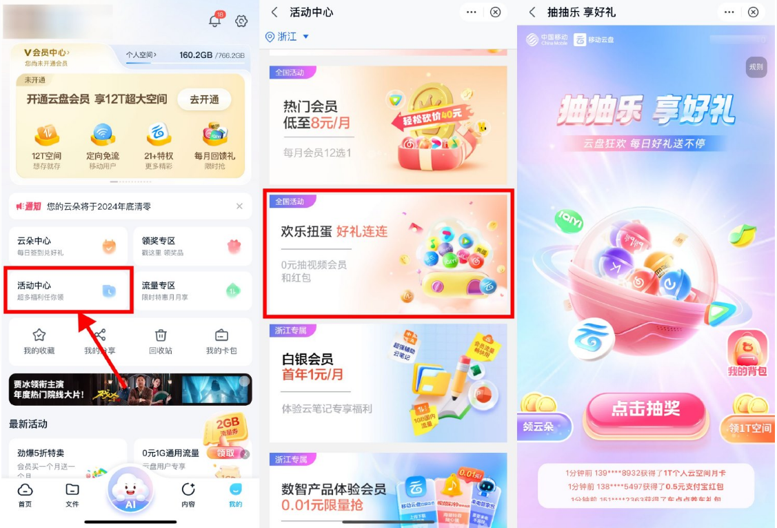 移动云盘APP底部“我的”->活动中心->欢乐扭蛋 好礼连连-> 每天无限次数抽立减金或视频会员周卡->累计4个视频会员碎片兑换月卡
