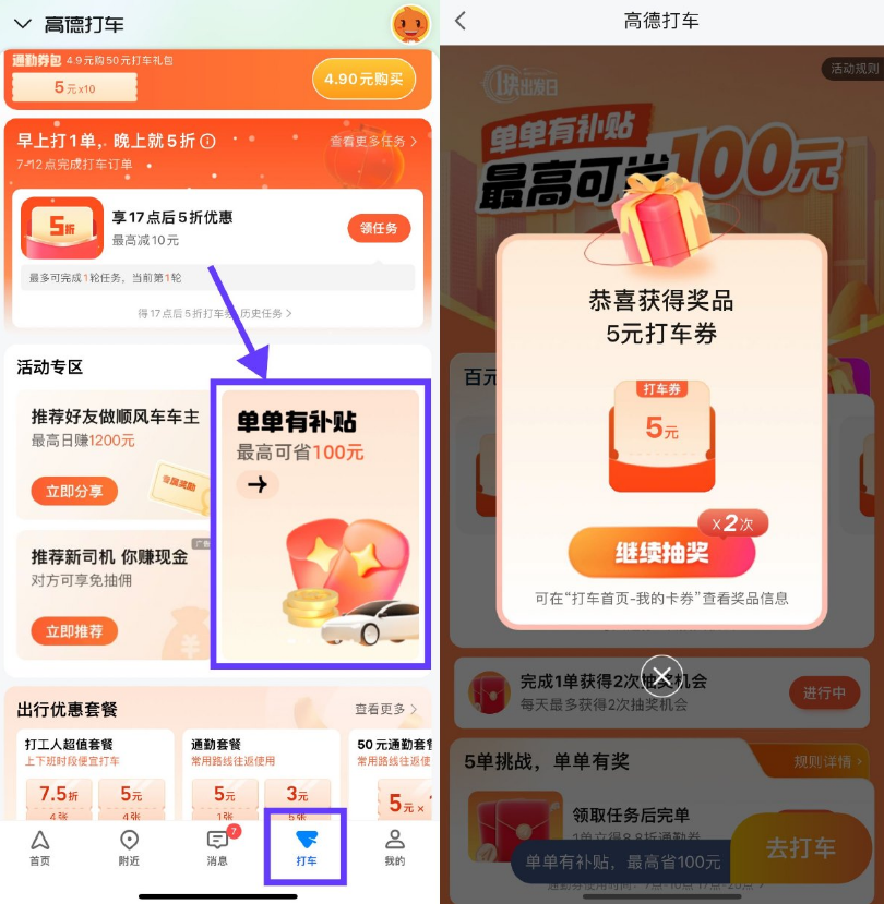 高德地图APP底部“打车”->轮播图“单单有补贴”和“新年好运礼包”每天3次机会抽1~100亓打车券