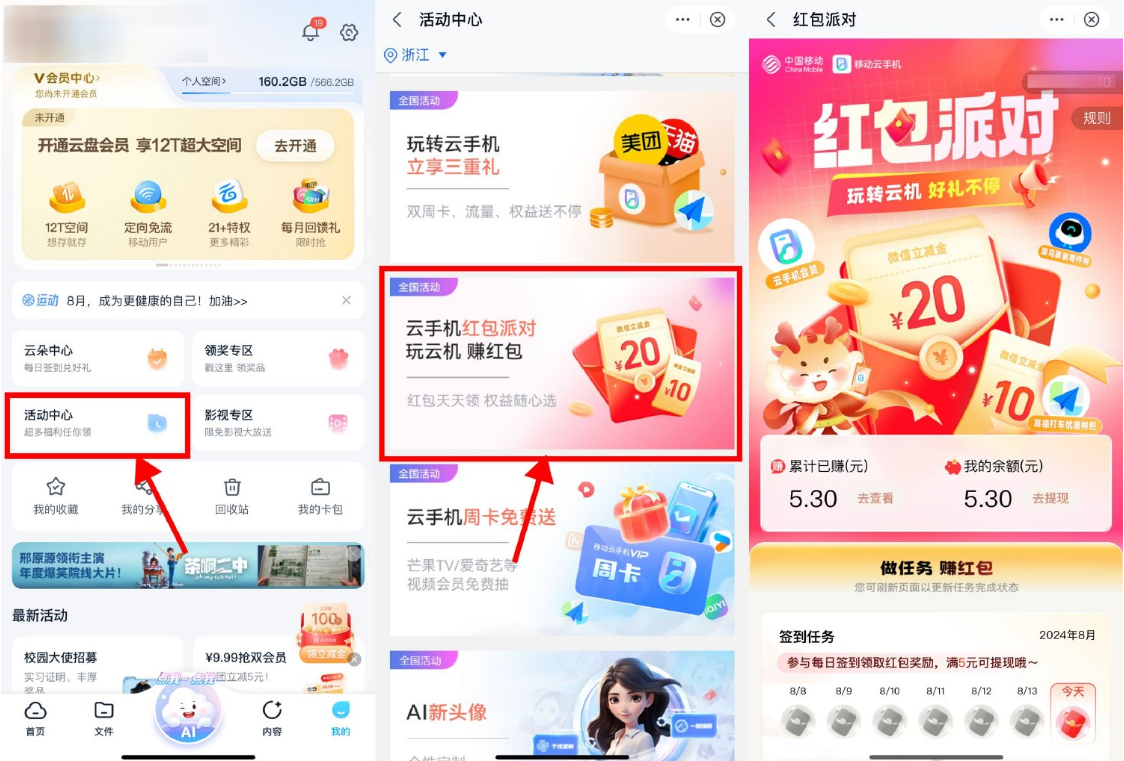 移动云盘APP->我的->活动中心->横幅“红包派队”-> 每天把所有做完,第3天就满5亓了 直接兑换立减金