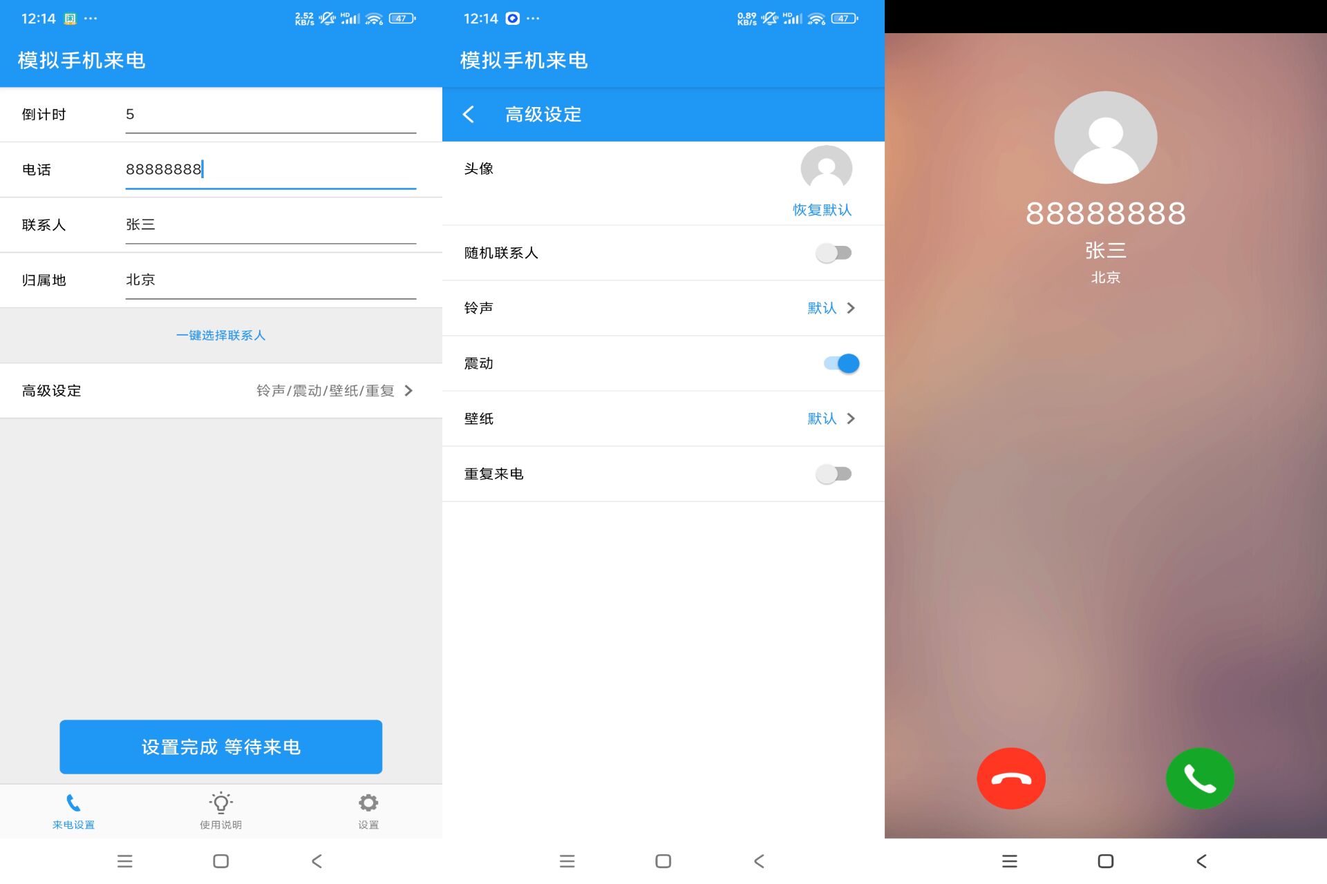 一款模拟手机来电APP,自定义设置模拟来电者昵称、头像、电话号码、铃声、震动方式等,为自己找个理由开溜,想要谁来电都可以。